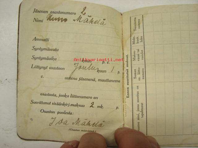 Sosiaalidemokraattisen työläisnuorisoliiton jäsenkirja - Pöytyän Mäkiäisten Sos.-dem Työlaisnuoriso-os., Uuno Mäkelä