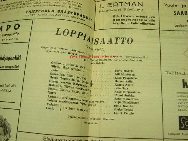 Tampereen teatteri näytäntökausi 1942-43 "Loppiaisaatto" -näytelmä, käsiohjelma