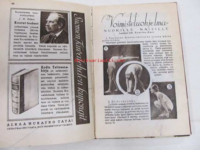 irtisaksittava kuvaleikki, Kuvalehden alennuskupongit, Voimisteluohjelma, Vilho Setälä Valokuvausopas, Kotiapteekki, Miten taideteoksia on katseltava, Voimistelusatu lapsille, ym. 12 x 17 cm.