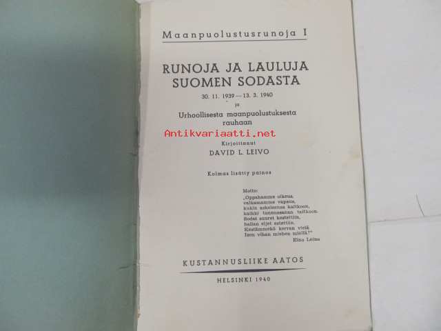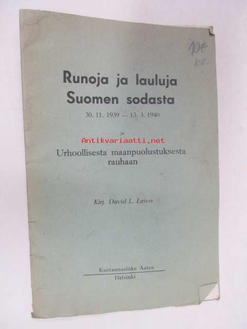Runoja ja lauluja Suomen sodasta 30.11. 1939 - 13.3. 1940 ja Urhoollisuudesta maanpuolustuksesta rauhaan