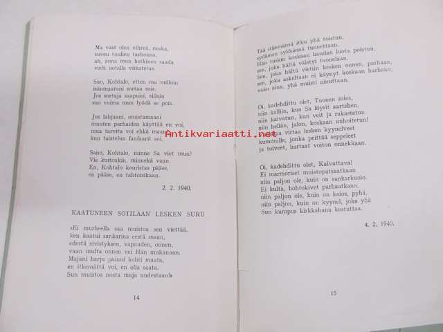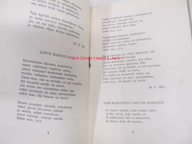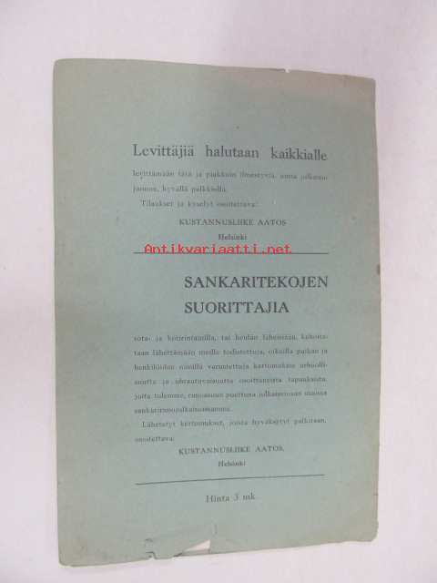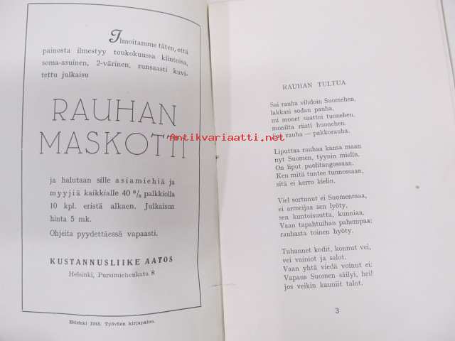 | Saatavilla | 1 kpl | | Julkaisuvuosi | 1940 | | Sivuja | 16 | | Painos | 3. | | Kunto | K2 | | Sidonta/painoasu | Vihko | | Kielet | Suomi |