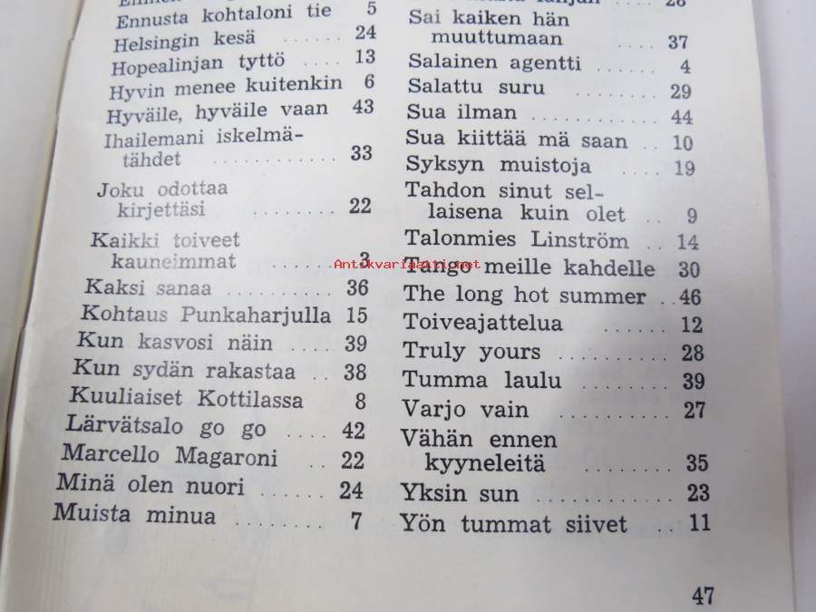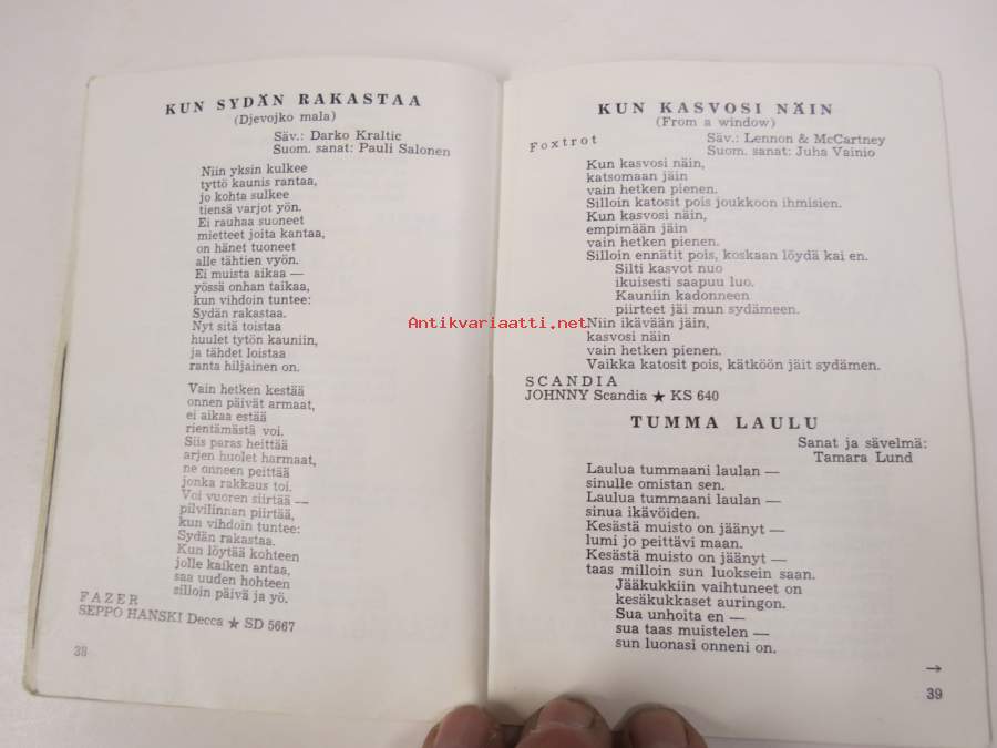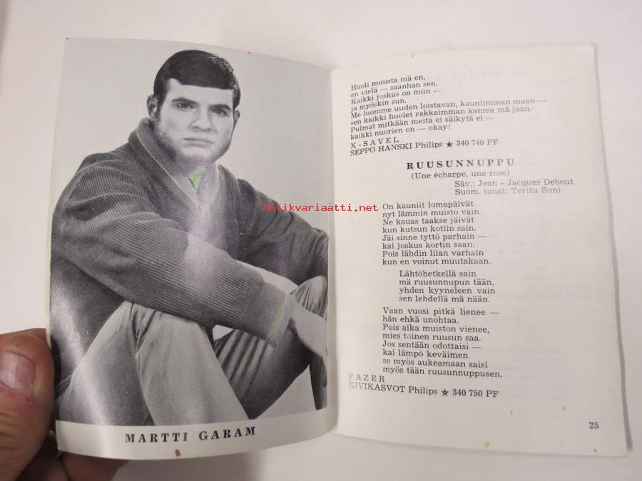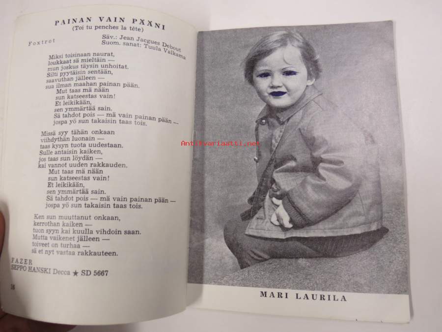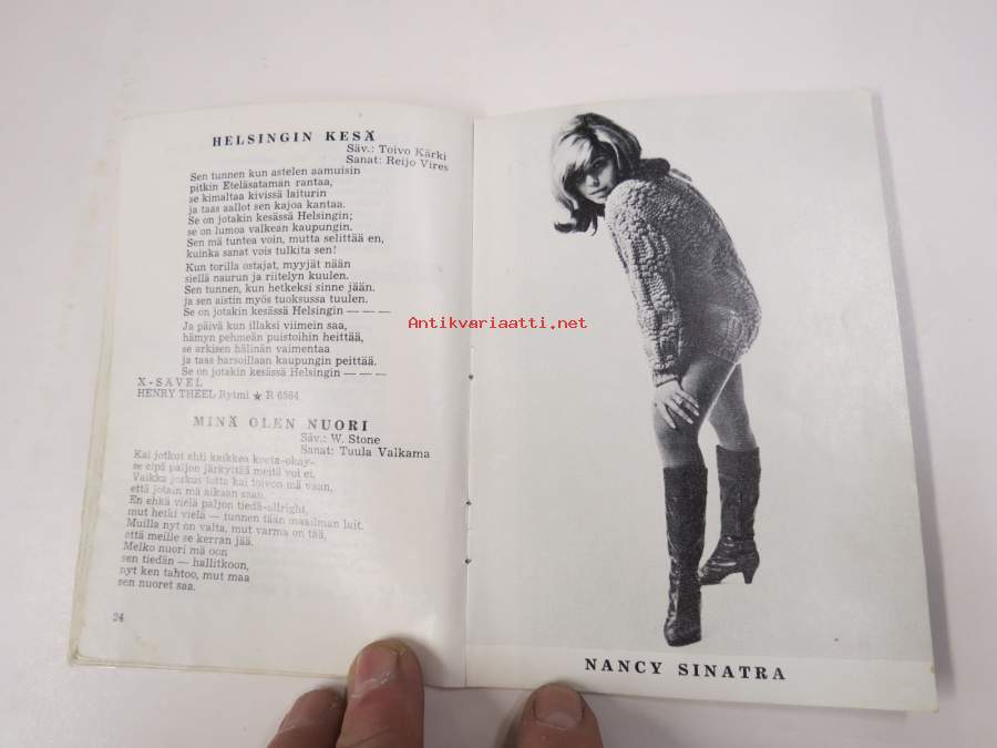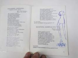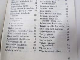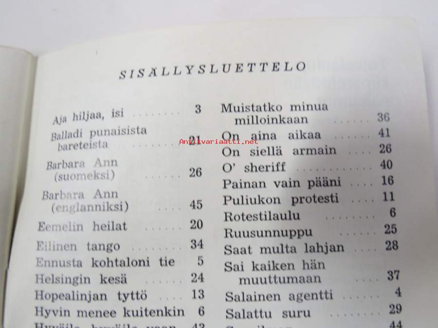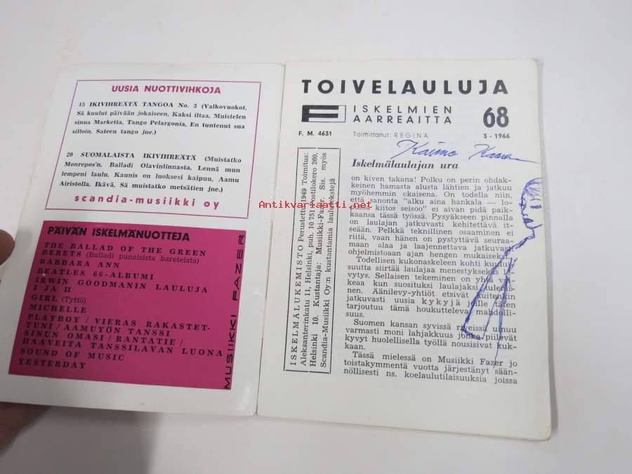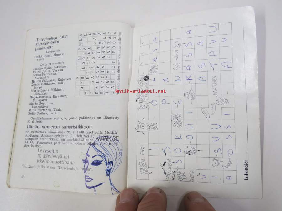 | Saatavilla | 1 kpl | | Julkaisuvuosi | 1966 | | Sivuja | 50 | | Painos | 1. | | Kunto | K2 | | Piirroksia ja kirjoituksia sivuilla | | Sidonta/painoasu | Vihko | | Kielet | Suomi |