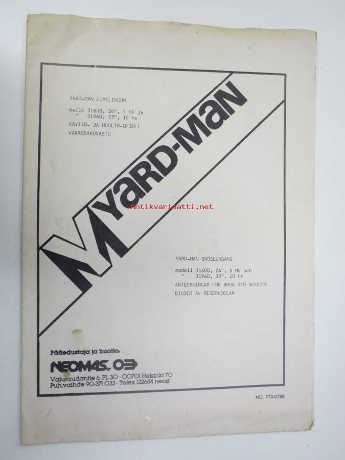 Yard-Man lumilinko 31600 24" 5 hv & 3196033 " 10 hv -käyttöohjekirja ja varaosaluettelo / snöslinga instruktionsbok och reservdelar