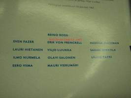 | Saatavilla | 1 kpl | | Julkaisuvuosi | 1967 | | Sivuja | 12 | | Kunto | K3 | | Sidonta/painoasu | Nidottu (pehmeäk.) | | Kielet | Suomi |