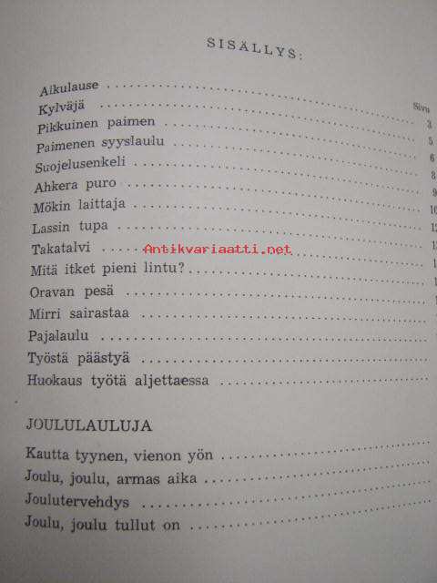 | Saatavilla | 1 kpl | | Julkaisuvuosi | 1954 | | Sivuja | 30 | | Painos | 1. | | Kunto | K2 | | Sidonta/painoasu | Nidottu (pehmeäk.) | | Kielet | Suomi |