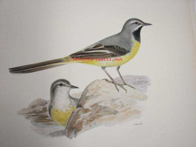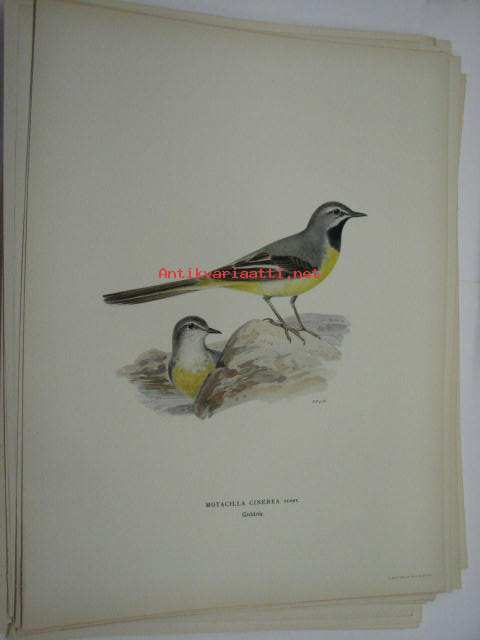 Motacilla cinerea Virtavästäräkki . Kaksi lintua kuvassa / Gråärla / -painokuva Svenska fåglar