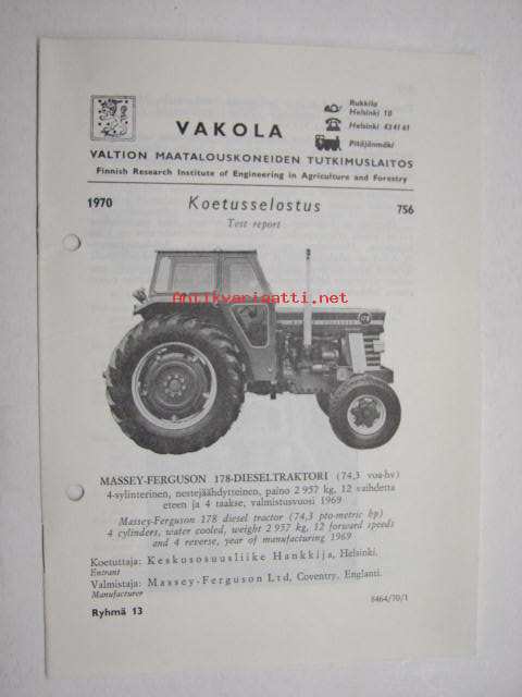 Massey-Ferguson 178 Dieseltraktori Vakola koetusselostus 756 1970