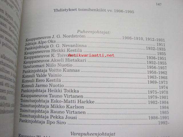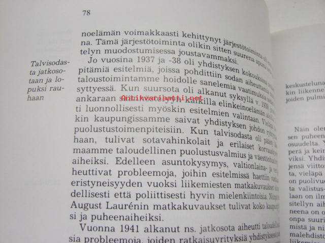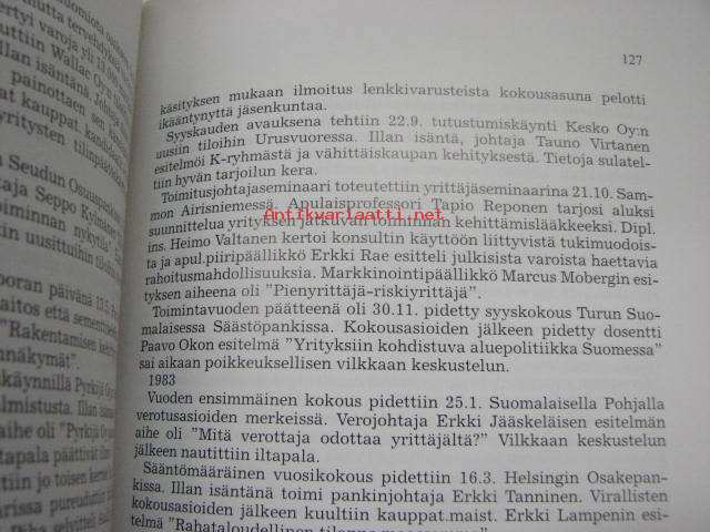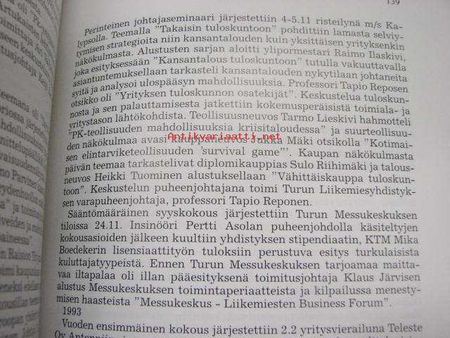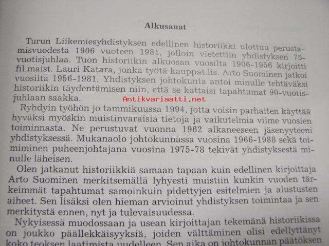 | Saatavilla | 1 kpl | | Julkaisuvuosi | 1996 | | Sivuja | 157 + kuvasivut | | Painos | 1. | | Kunto | K3 | | Sidonta/painoasu | Nidottu (pehmeäk.) | | ISBN | 952-90-7234-1 | | Kielet | Suomi |