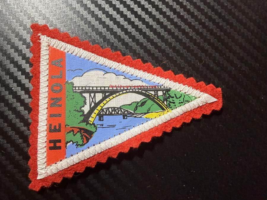 Heinola -kangasmerkki / matkailumerkki / hihamerkki / badge -pohjaväri punainen
