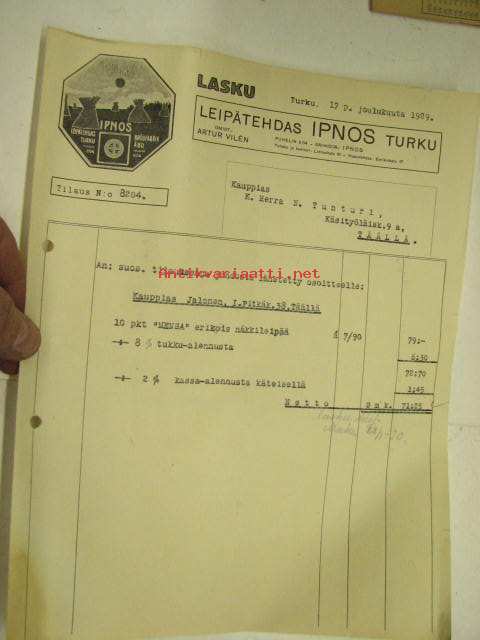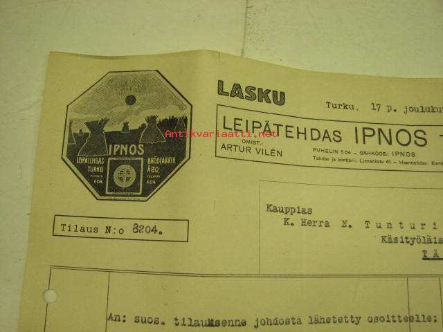 Leipätehdas Ipnos Turku, N. Tunturi, 17.12.1929 -asiakirja