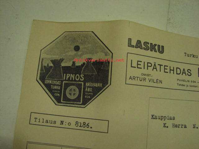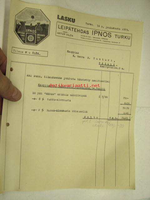 Leipätehdas Ipnos Turku, N. Tunturi, 14.12.1929 -asiakirja