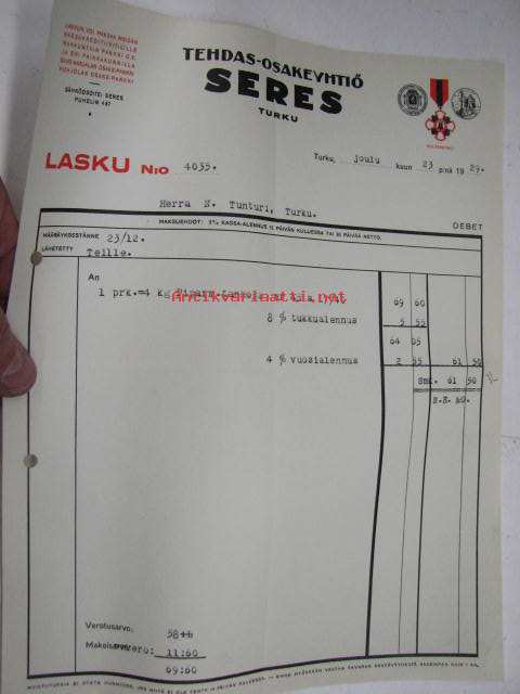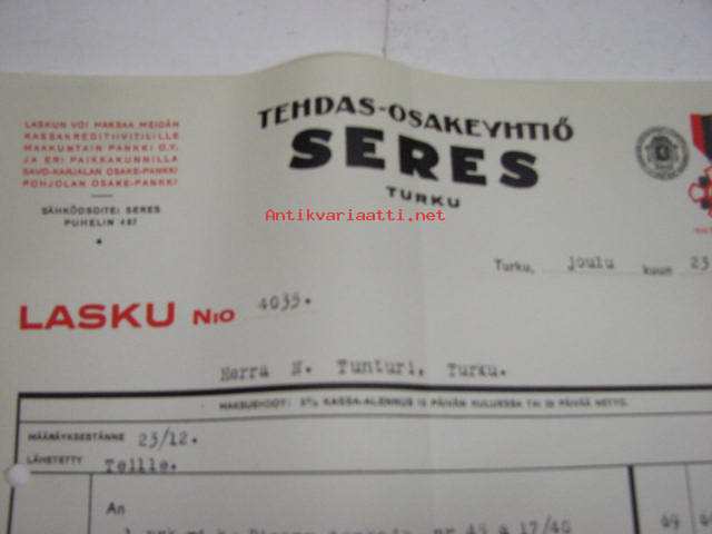 Tehdas Oy Seres, Turku / Niilo Tunturi, Turku, 23.12.1929 -asiakirja