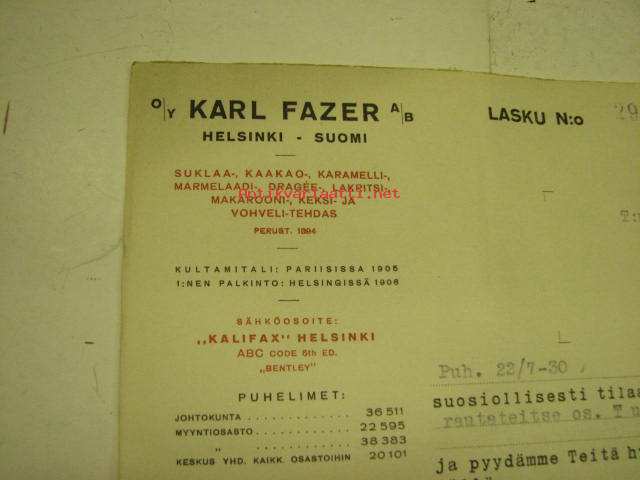 Oy Karl Fazer Ab, Helsinki / Niilo Tunturi, Turku, 29.7.1930 -asiakirja