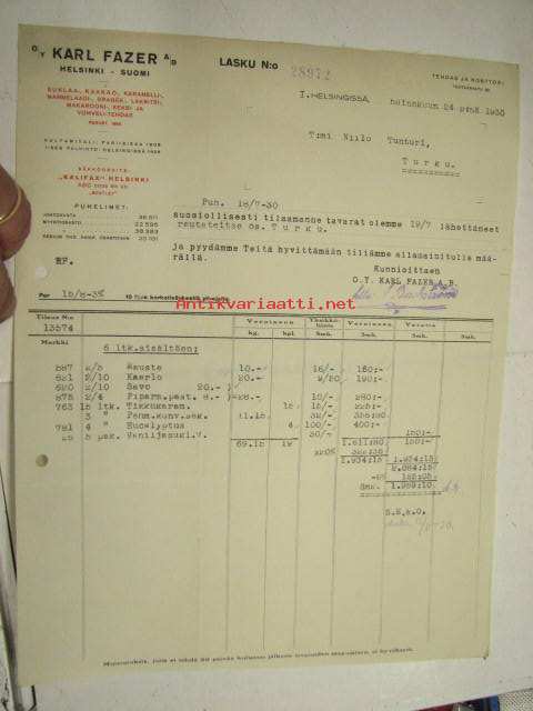 Oy Karl Fazer Ab, Helsinki / Niilo Tunturi, Turku, 24.7.1930 -asiakirja