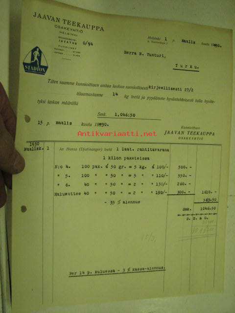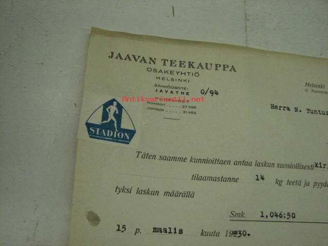 Jaavan Teekauppa Oy, Helsinki / Niilo Tunturi, Turku, 1.3.1930 -asiakirja