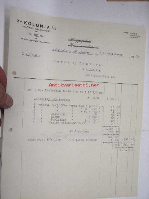 Oy Kolonia Ab, Helsinki / Niilo Tunturi, Turku, 6.2.1930 -asiakirja