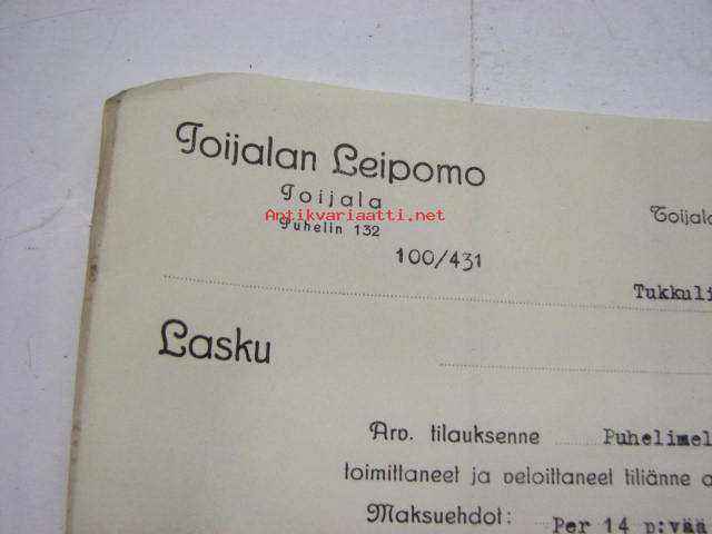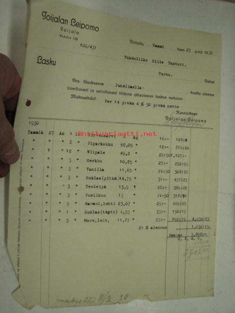 Toijalan Leipomo Oy, Toijala / Niilo Tunturi, Turku, 27.1.1930 -asiakirja