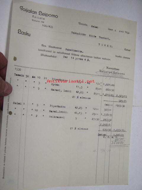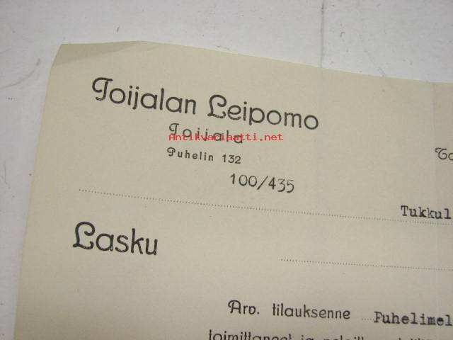 Toijalan Leipomo Oy, Toijala / Niilo Tunturi, Turku, 1.2.1930 -asiakirja