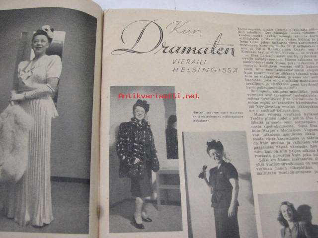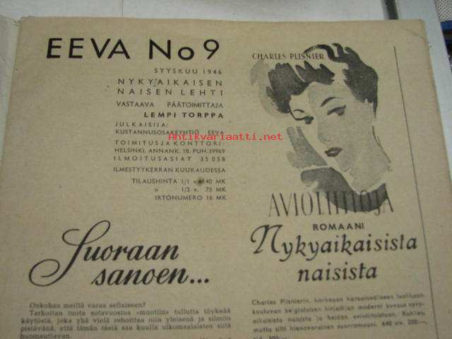 Kustannusosakeyhtiö Eeva, 1946Eeva 1946 nr 9 lokakuu, sis. mm. seur. artikkelit / kuvat; kansikuva Ella Eronen, Neuvostonainen urheilee, Kesäleskien partnerit puhuvat, Maria Niemi (Karstula) - Olin keittäjättärenä Rockefellerillä ym.