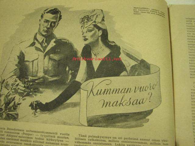 | Saatavilla | 1 kpl | | Julkaisuvuosi | 1946 | | Sivuja | 32 | | Kunto | K2 | | Sidonta/painoasu | Lehti | | Kielet | Suomi |