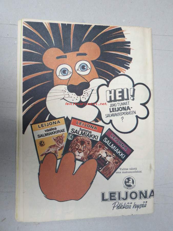 | Saatavilla | 1 kpl | | Julkaisuvuosi | 1972 | | Kunto | K2 | | Kulunut, vikoja, niitit ruosteessa | | Sidonta/painoasu | Lehti | | Kielet | Suomi |