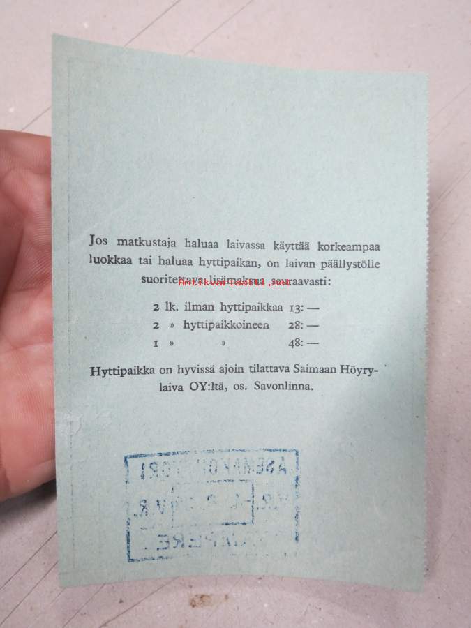 Rengasmatkakuponki 3 Luokka Vuoksenniska - Savonlinna tai Svaonlinna - Vuoksenniska, VR Tampere 4.8.1938 -matkalippu