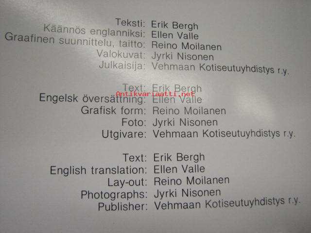 | Saatavilla | 1 kpl | | Julkaisuvuosi | 1987 | | Sivuja | 181 | | Painos | 1. | | Kunto | K3 | | Sidonta/painoasu | Sidottu (kansipaperit) | | ISBN | 951-99837-7-5 | | Kielet | Suomi, Ruotsi, Englanti |