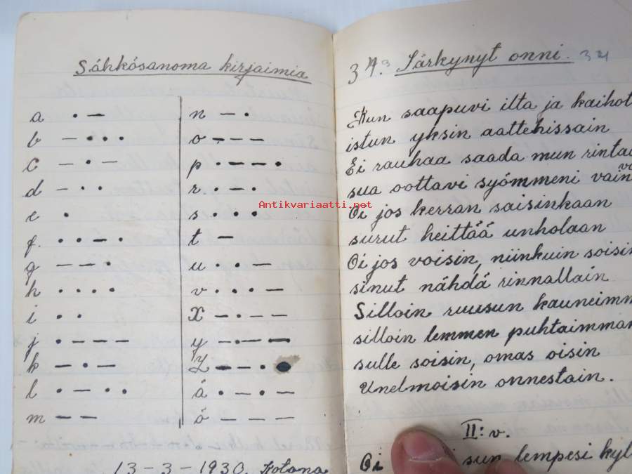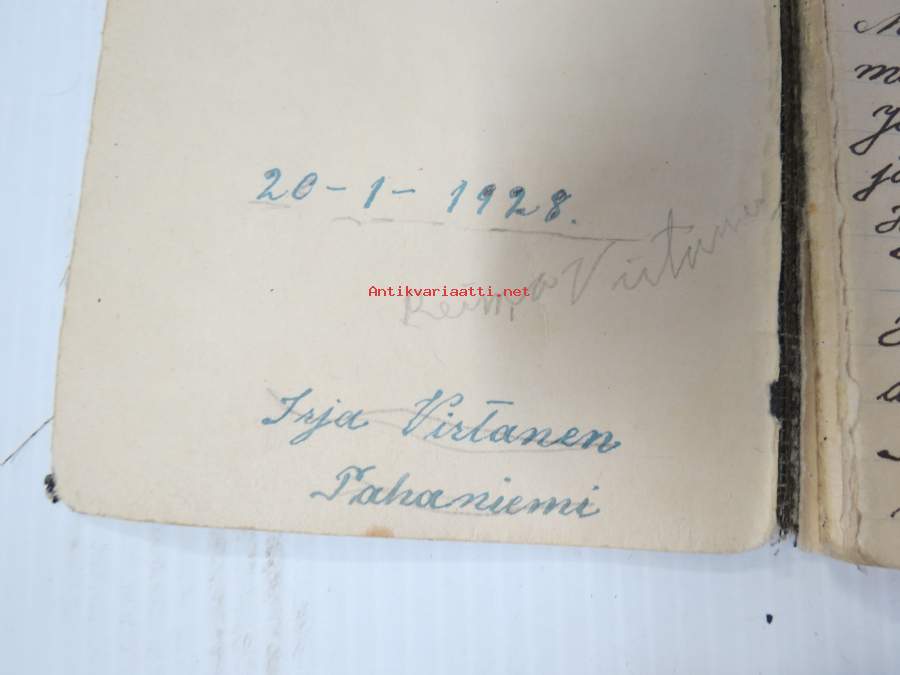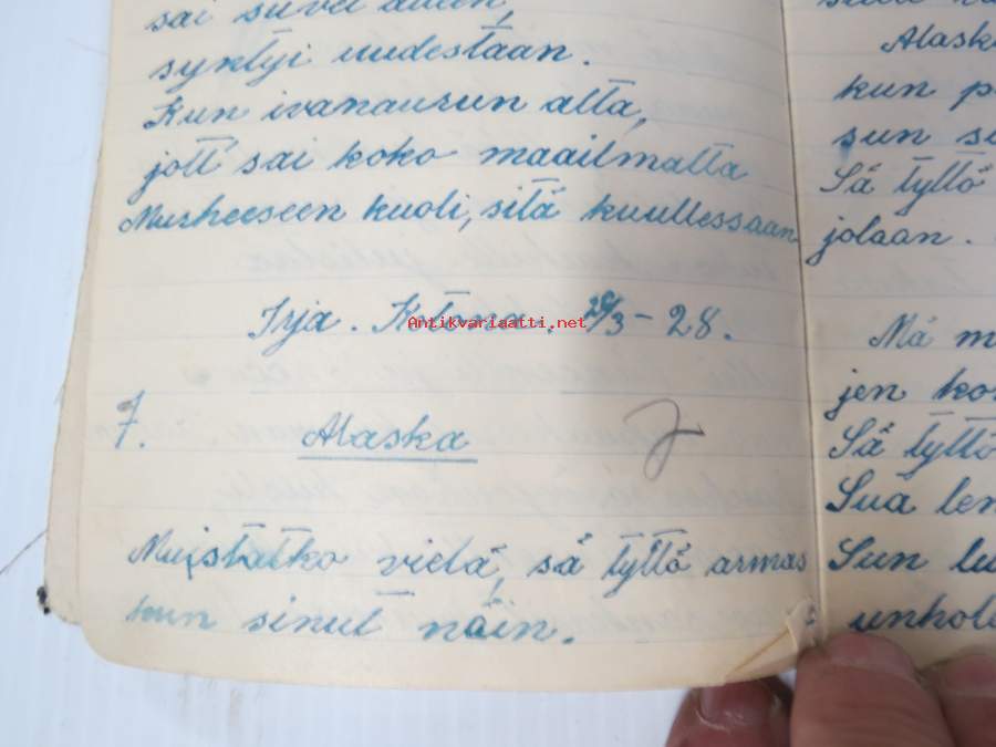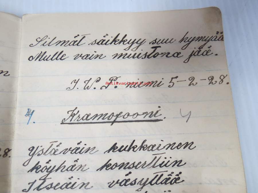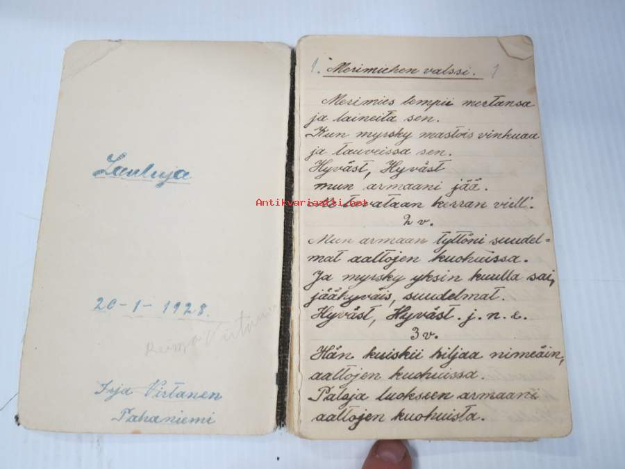 Lauluja - 1928, perinteinen musta vahakantinen vihko, johon kirjoitettu laulujen sanoja