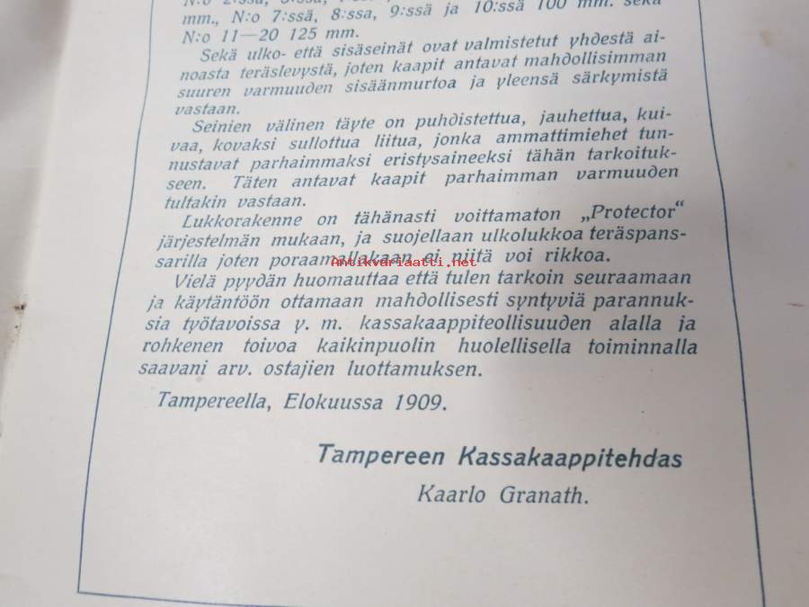 Tampereen kassakaappitehdas - Kaarlo Granath - Hintaluettelo kassakapeista 1909