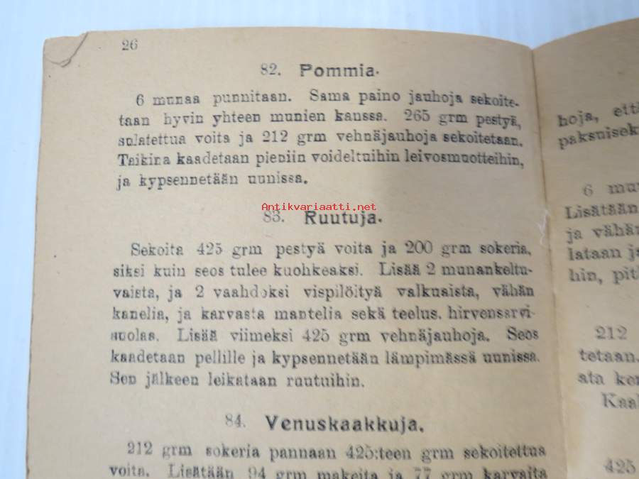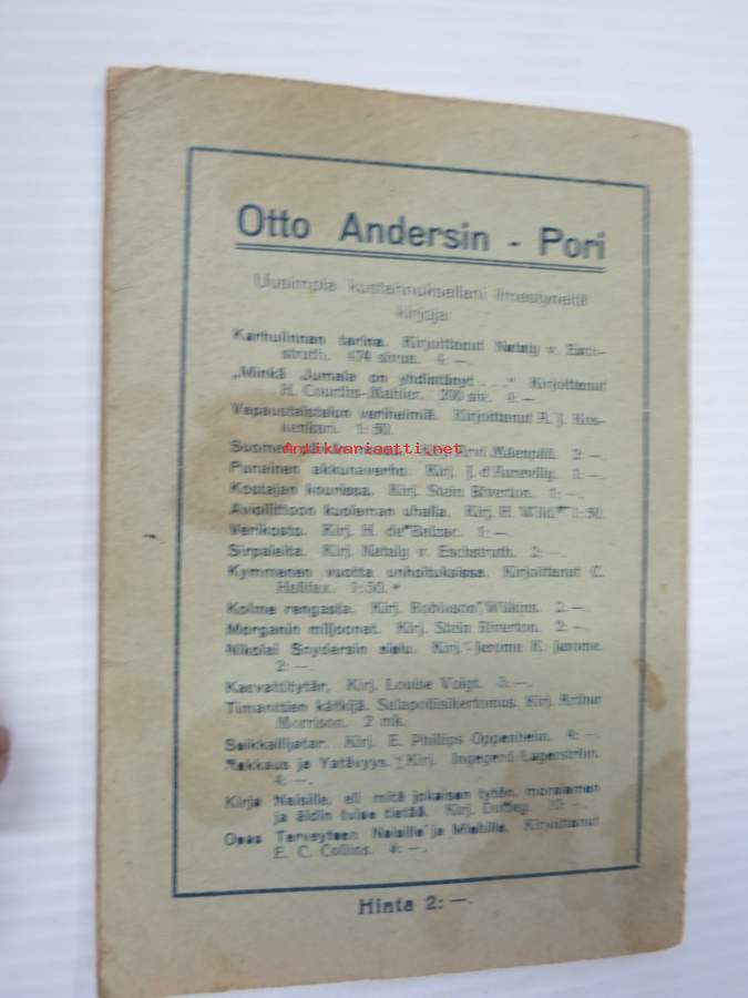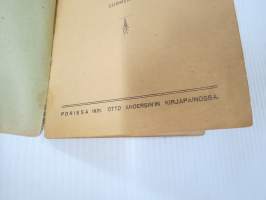 | Saatavilla | 1 kpl | | Julkaisuvuosi | 1921 | | Sivuja | 30 | | Painos | 1. | | Kunto | K2 | | Sidonta/painoasu | Nidottu (pehmeäk.) | | Kielet | Suomi |