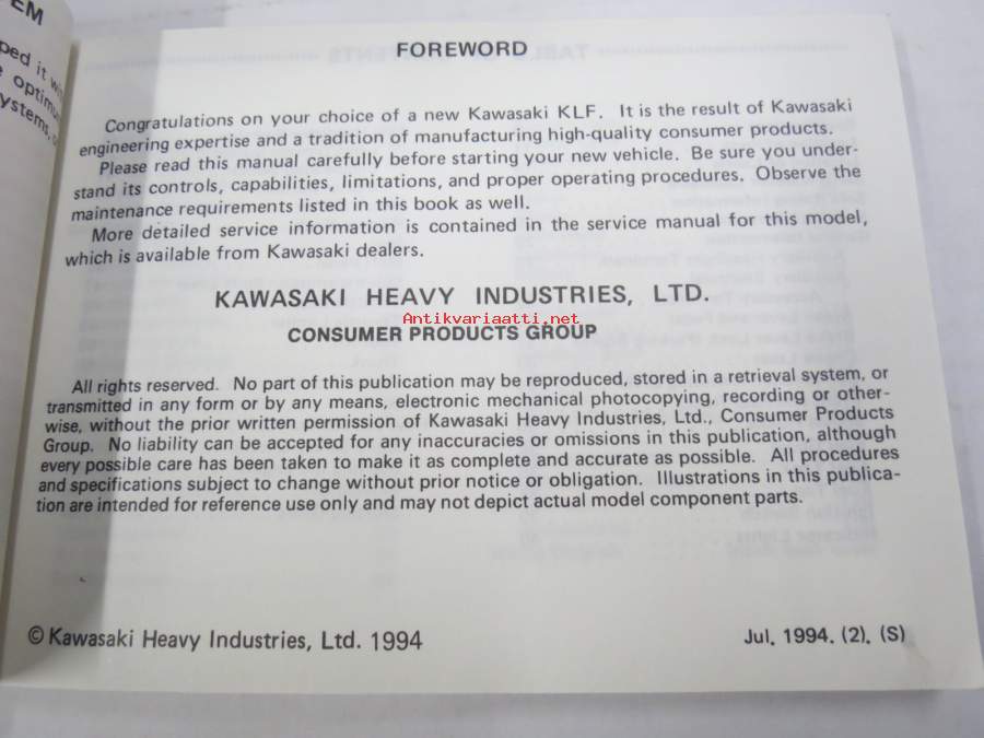 Kawasaki KLF 300 4X€ All Terrain Vehicle ATV Owner´s Manual -mönkijä, käyttöohjekirja englanniksi