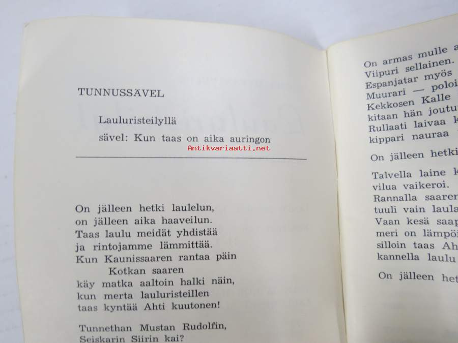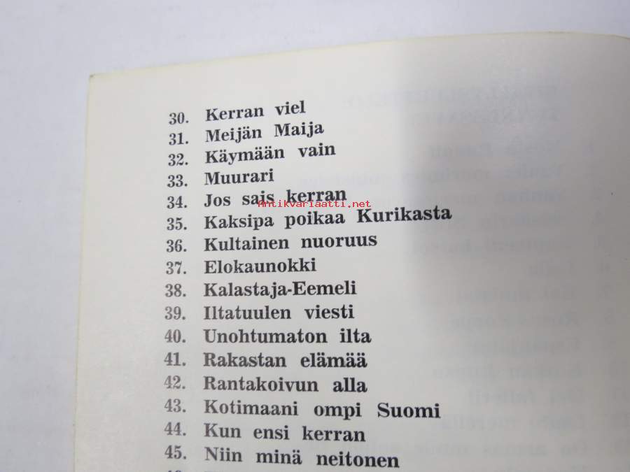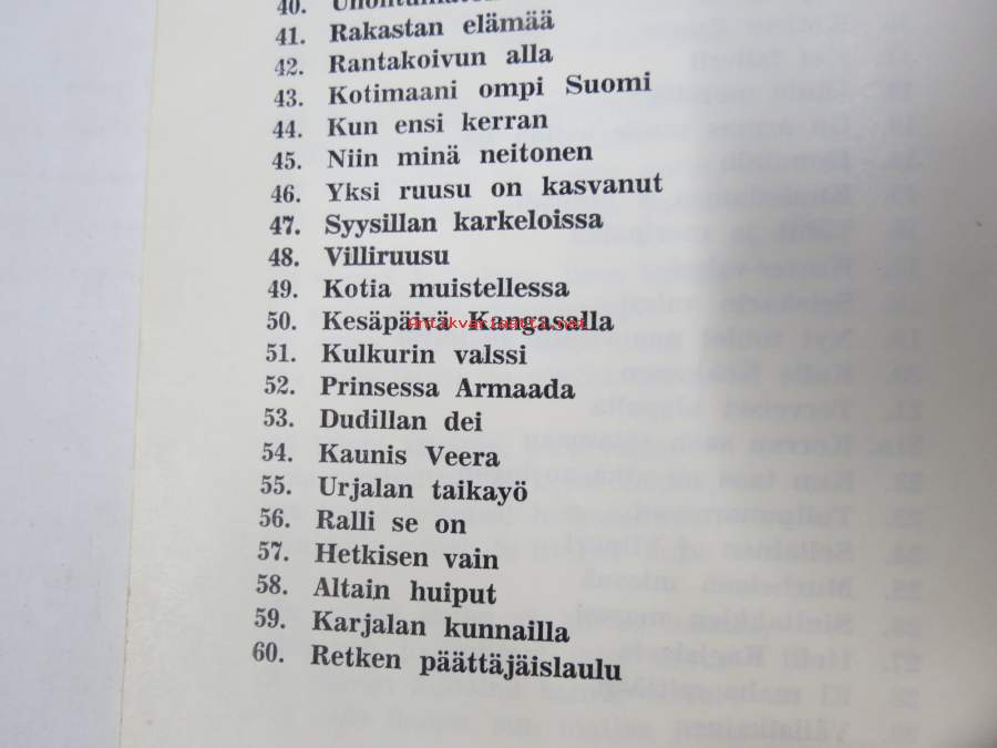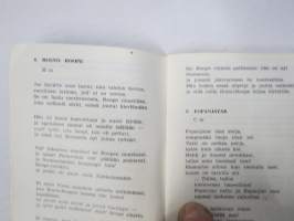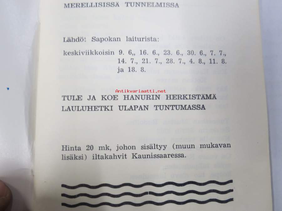 | Saatavilla | 1 kpl | | Julkaisuvuosi | 1975 | | Painos | 1. | | Kunto | K2 | | Sidonta/painoasu | Nidottu (pehmeäk.) | | Kielet | Suomi |