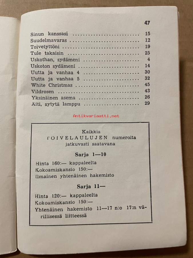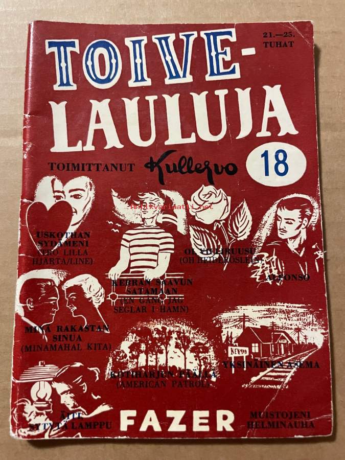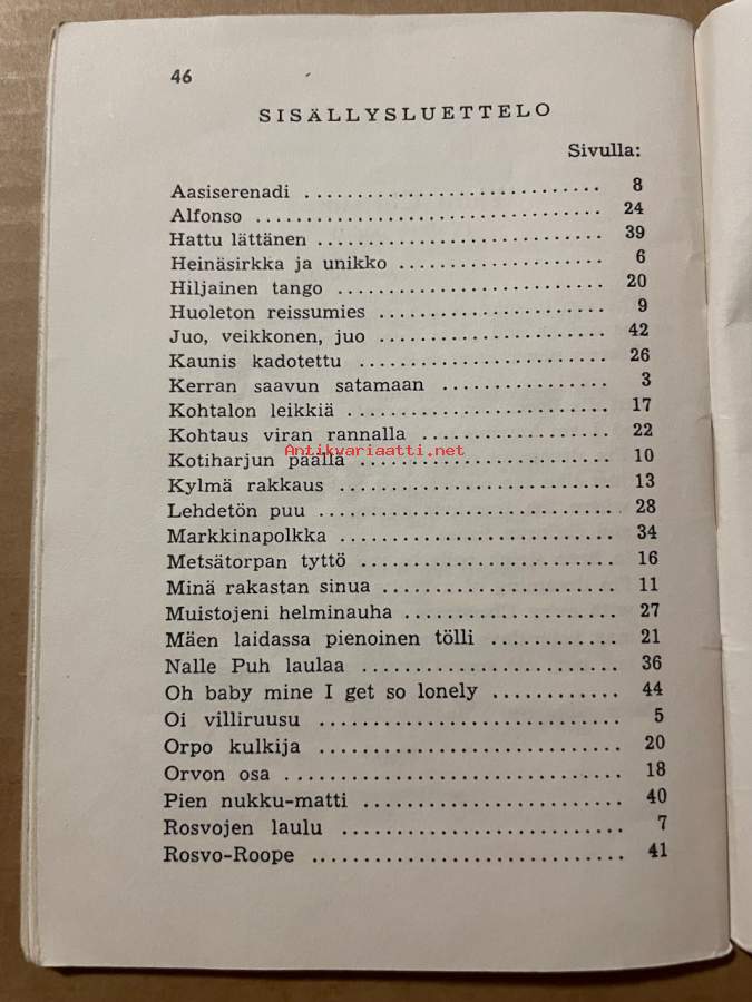 | Saatavilla | 1 kpl | | Julkaisuvuosi | 1954 | | Sivuja | 52 | | Kunto | K2 | | Sidonta/painoasu | Nidottu (pehmeäk.) | | Kielet | Suomi |