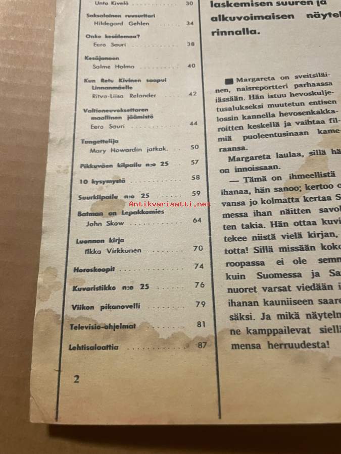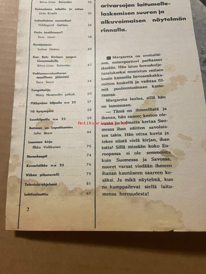 | Saatavilla | 1 kpl | | Julkaisuvuosi | 1966 | | Sivuja | 88 | | Kunto | K2 | | Sidonta/painoasu | Lehti | | Kielet | Suomi |