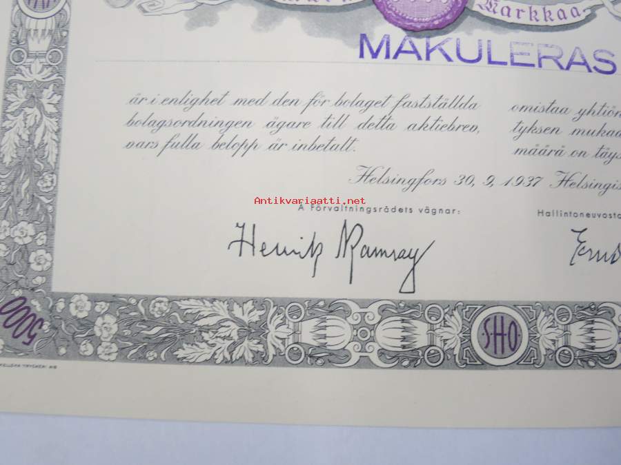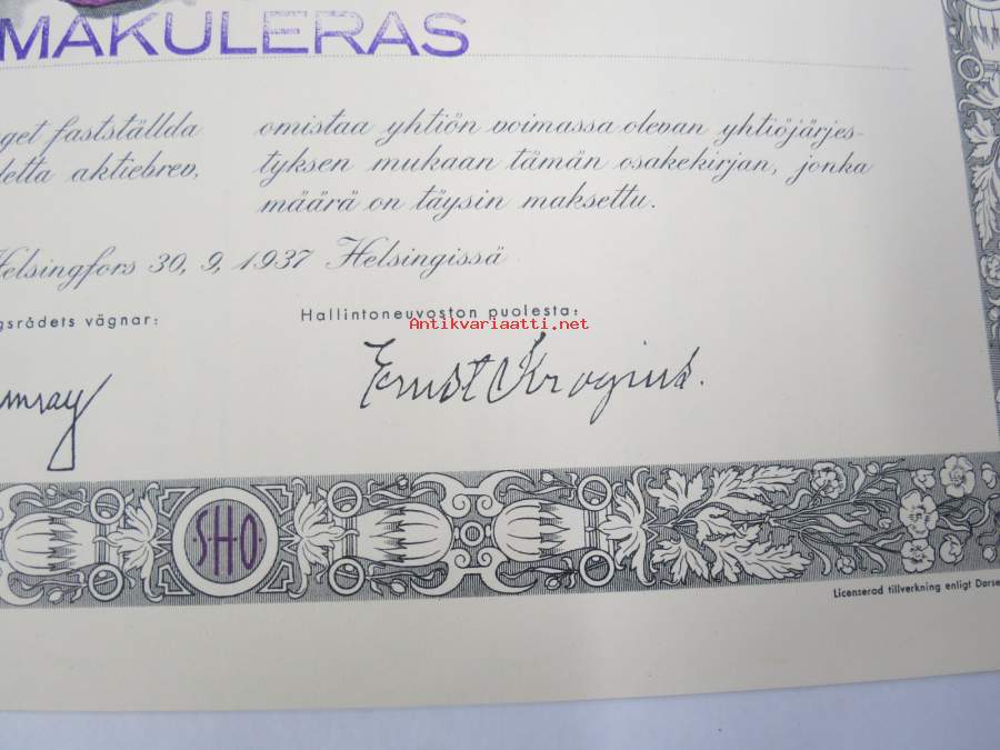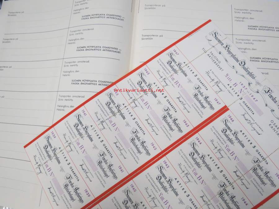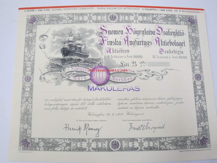 Suomen Höyrylaiva Osakeyhtiö - Finska Ångfartygs Aktiebolag, Helsinki 1937, 5 osaketta / 5 aktier á 1 000 mk, 5 000 mk, Litt. B -osakekirja / share certificate