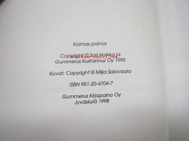 | Saatavilla | 1 kpl | | Julkaisuvuosi | 1998 | | Sivuja | 119 | | Painos | 3. | | Kunto | K3 | | Sidonta/painoasu | Kuvitettu kovakantinen | | ISBN | 951-20-4704-7 | | Kielet | Suomi |
