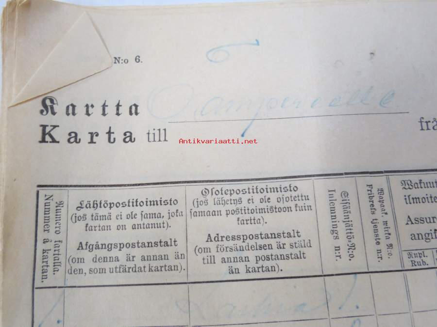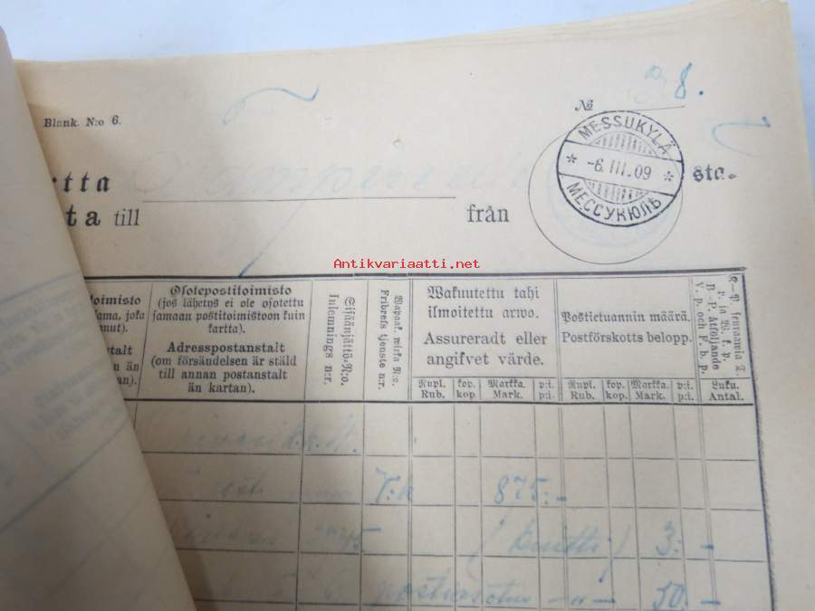 | Saatavilla | 1 kpl | | Julkaisuvuosi | 1909 | | Kunto | K2 | | Sidonta/painoasu | Pienpainate | | Kielet | Suomi, Ruotsi |