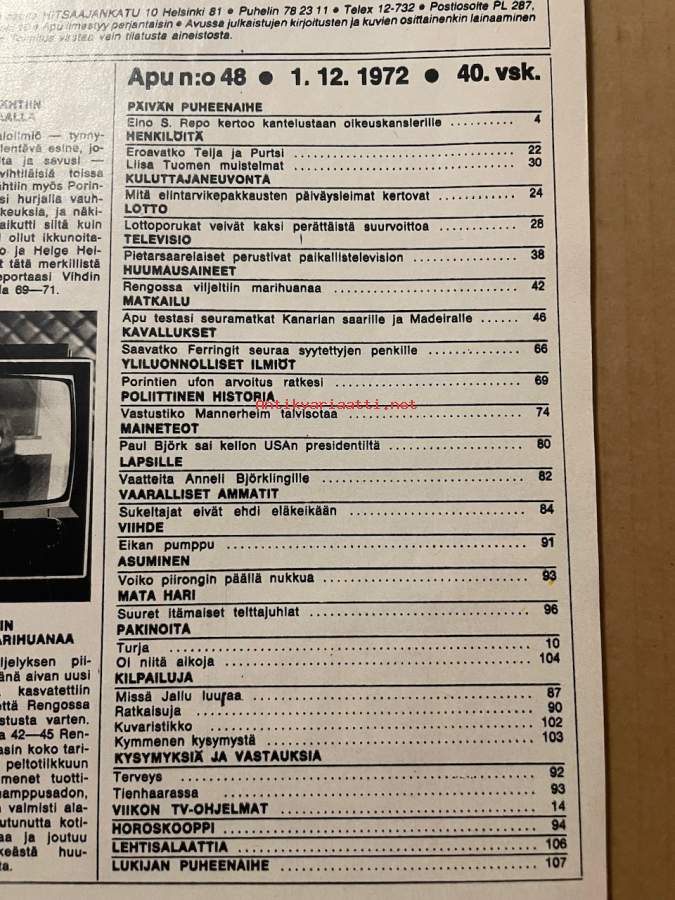 Apu 1972 nr 48, Teija ja Purtsi, Lottoporukat, Liisa Tuomi, USA:n presidentin lahjoittama kultakello (Paul Björk), Paperinuken asut Miss Skandinavia
