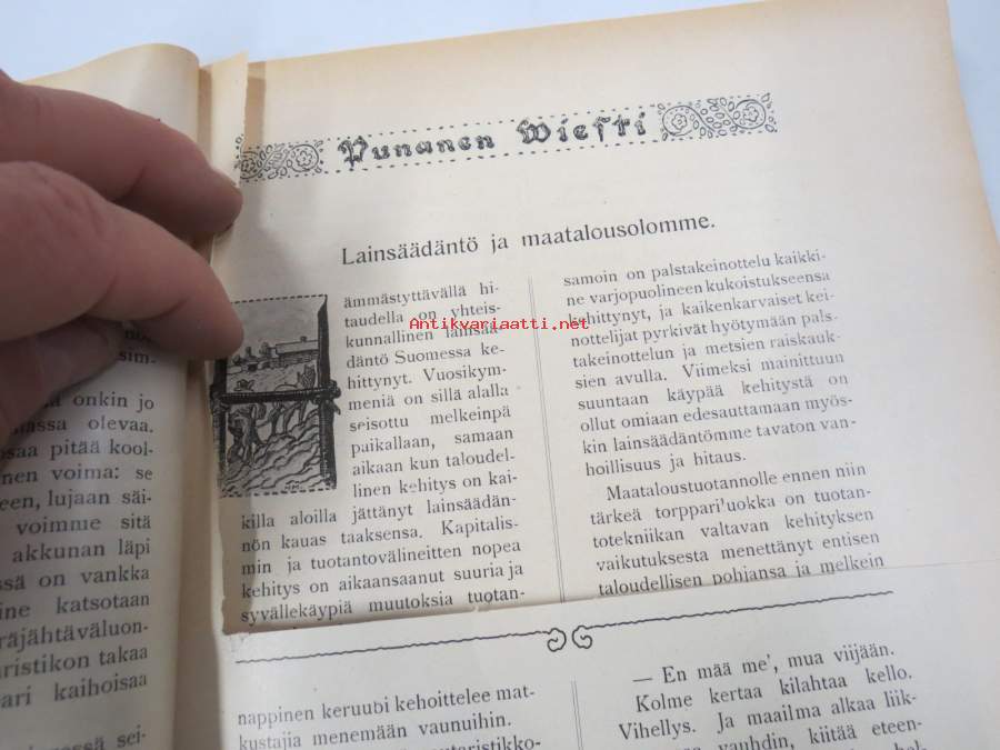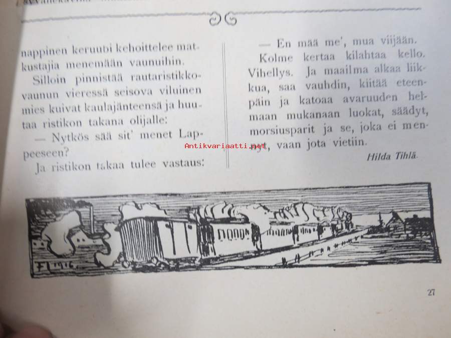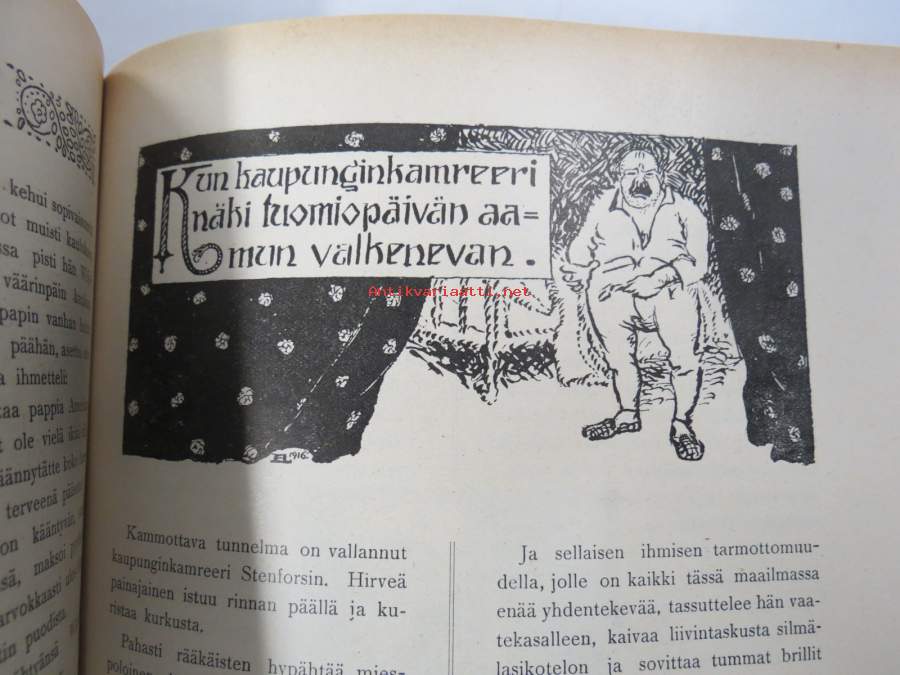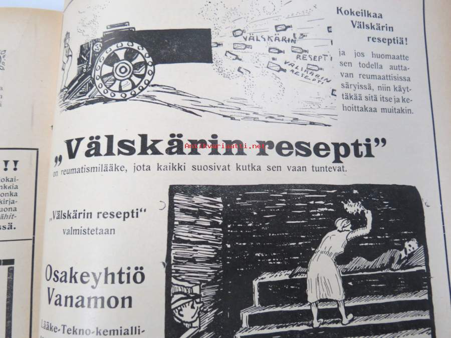 | Saatavilla | 1 kpl | | Julkaisuvuosi | 1916 | | Sivuja | 102 + mainossivut | | Kunto | K2 | | 1 kuva saksittu pois | | Sidonta/painoasu | Nidottu (pehmeäk.) | | Kielet | Suomi |