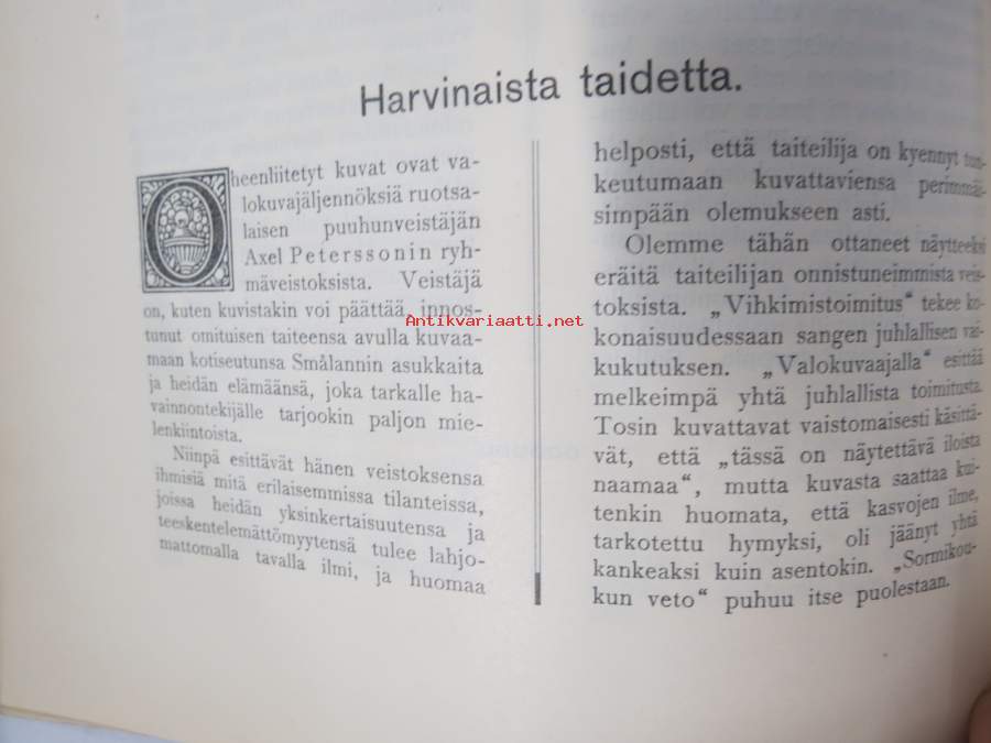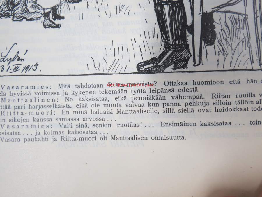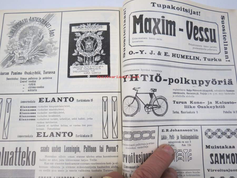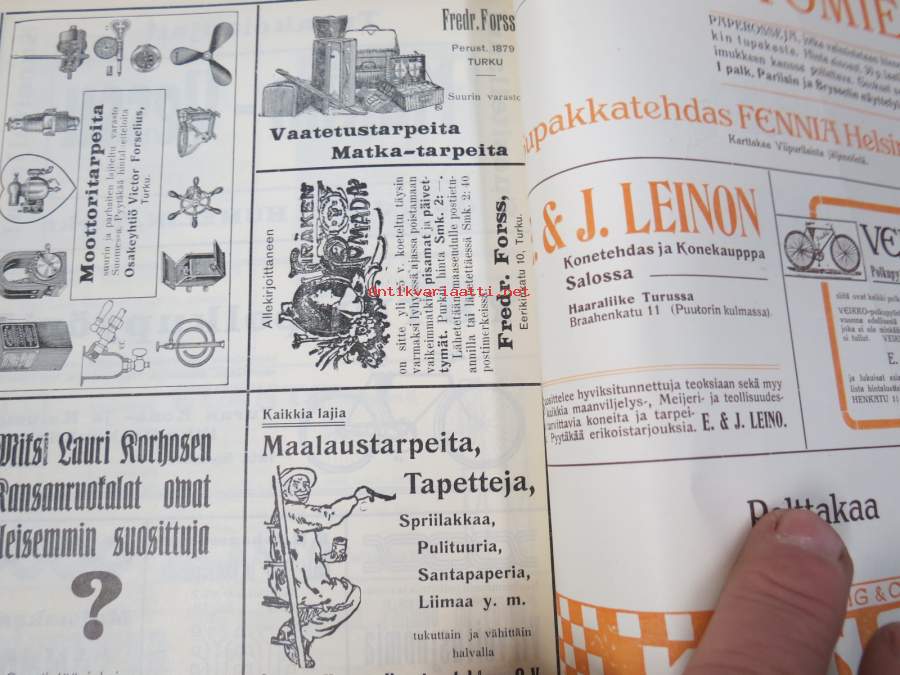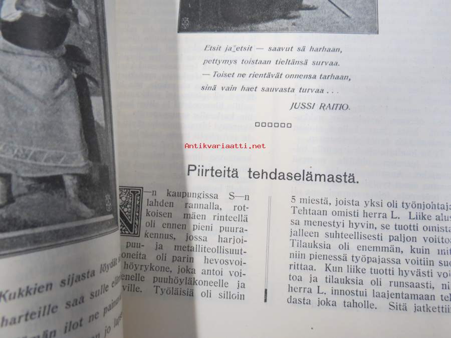 | Saatavilla | 1 kpl | | Julkaisuvuosi | 1913 | | Sivuja | 88 + mainossivut | | Kunto | K2 | | Yksi kuva saksittu pois | | Sidonta/painoasu | Nidottu (pehmeäk.) | | Kielet | Suomi |