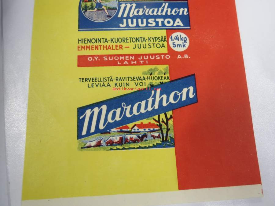 Täyslihavaa Marathon Juustoa - Hienointa-Kuoretonta-Kypsää Emmenthaler juustoa - Oy Suomen Juusto Ab, Lahti -etiketti