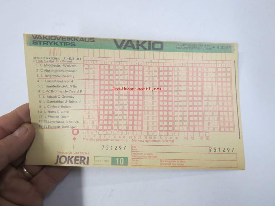 Veikkauskuponki - Vakioveikkaus - Stryktips 7-8.3.1981, nr 751297