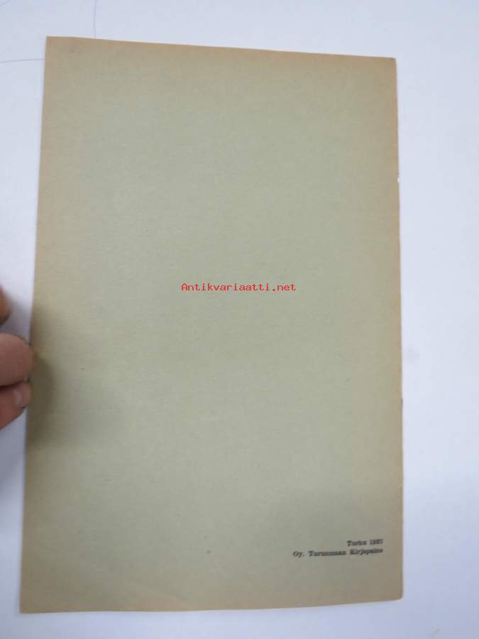 | Saatavilla | 1 kpl | | Julkaisuvuosi | 1937 | | Sivuja | 17 | | Kunto | K3 | | Sidonta/painoasu | Nidottu (pehmeäk.) | | Kielet | Suomi |