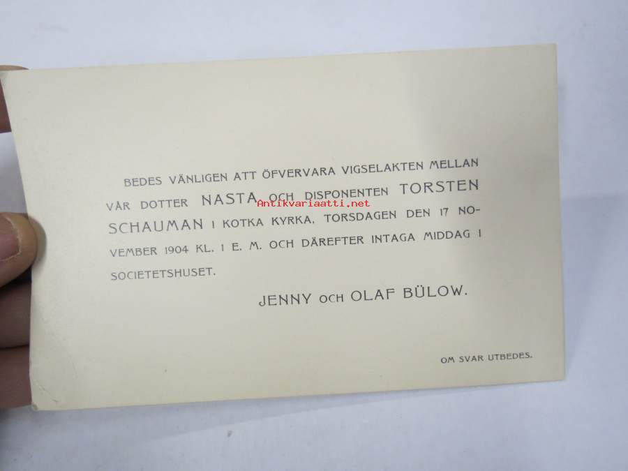 Bedes vänligen att öfverfara vigselakten... vår dotter Nasta von Bülow och Torsten Schauman i Kotka kyrka 17.11.1904... Jenny & Olaf Bülow -kutsukortti