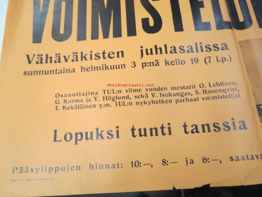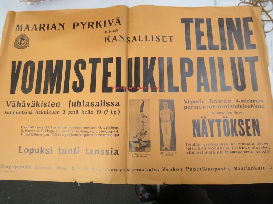 Maarian Pyrkivä, 1935Mukana mm. O. Lehtinen, G. Karma, Y. Höglund, V. Isokangas, S. Rosenqvist, T. Kekäläinen, 50 x 60 cm juliste.