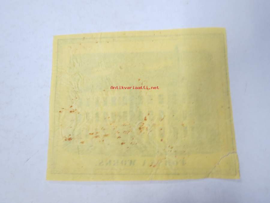 Yksittäinen etiketti 10 x 13 cm, erittäin harvinainen kangaspakan pakkausetiketti, mahdollisesti aivan ensimmäisiä säilyneitä tehtaan kangaspakkaetikettejä?
