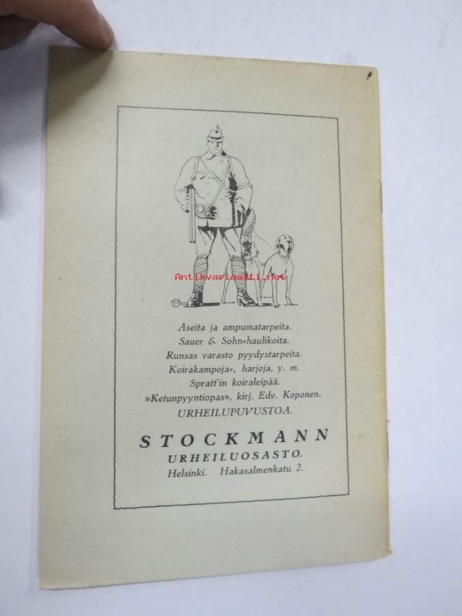 | Saatavilla | 1 kpl | | Julkaisuvuosi | 1926 | | Sivuja | 40 | | Painos | 1. | | Kunto | K2 | | Sidonta/painoasu | Nidottu (pehmeäk.) | | Kielet | Suomi |