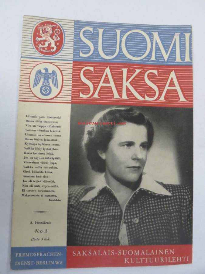 Suomi-Saksa 1942 nr 2 - saksalais-suomalainen kulttuuri- / propagandalehti, päätoimittaja H. von Grönhagen, Ritva Ristolainen Saksan akatemian kursseilla, Aseveljeys