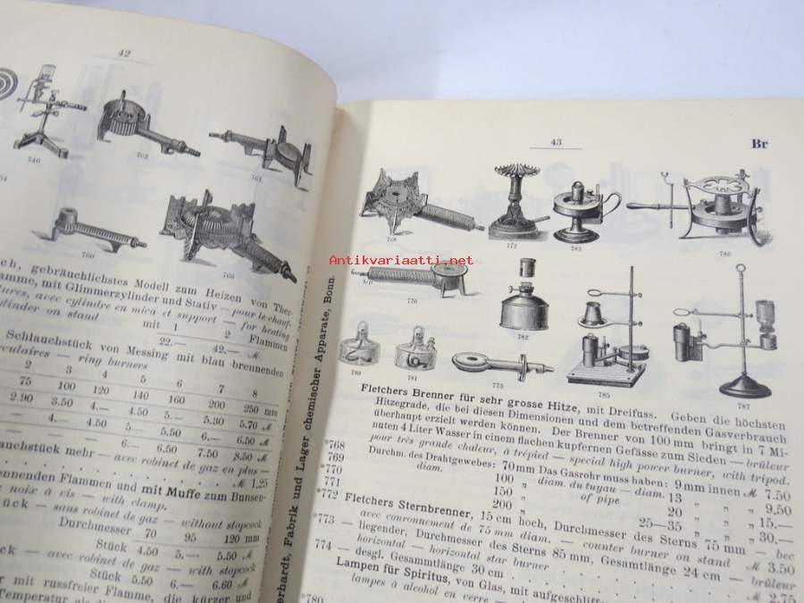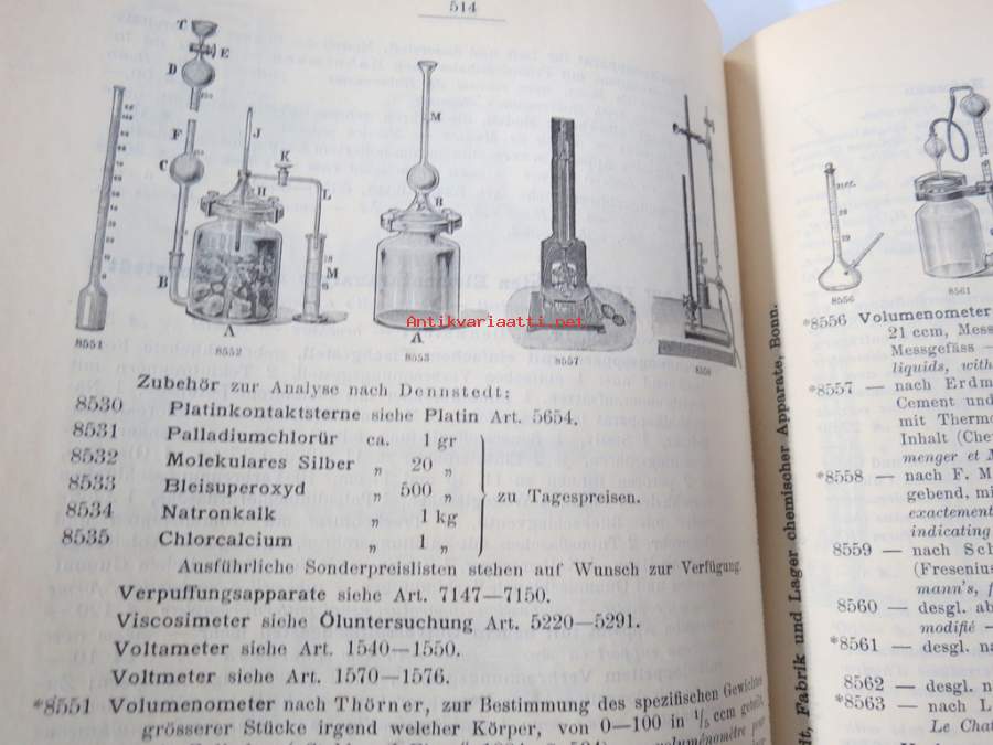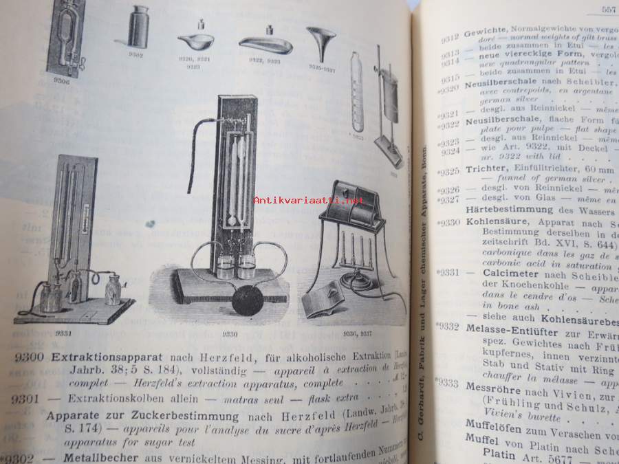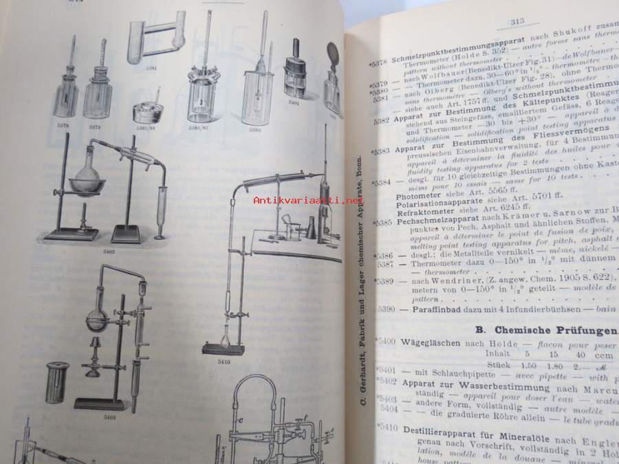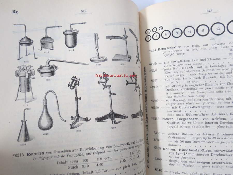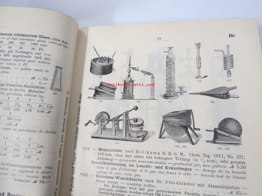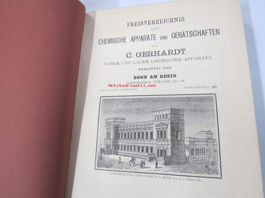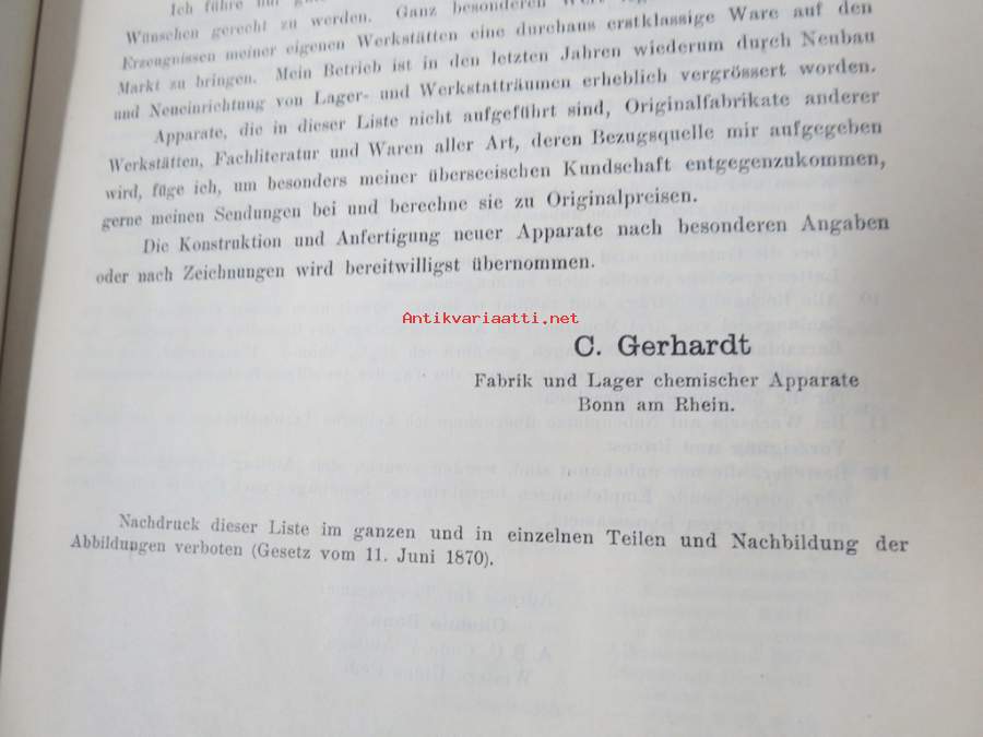C. Gerhardt Preisverzeichnis über Chemische Apparate und Gerätschaften -kemianalan kojeita ja laitteita, kuvasto, saksankielinen