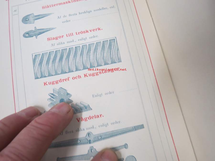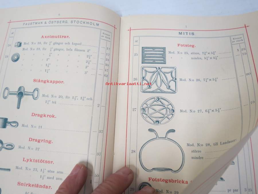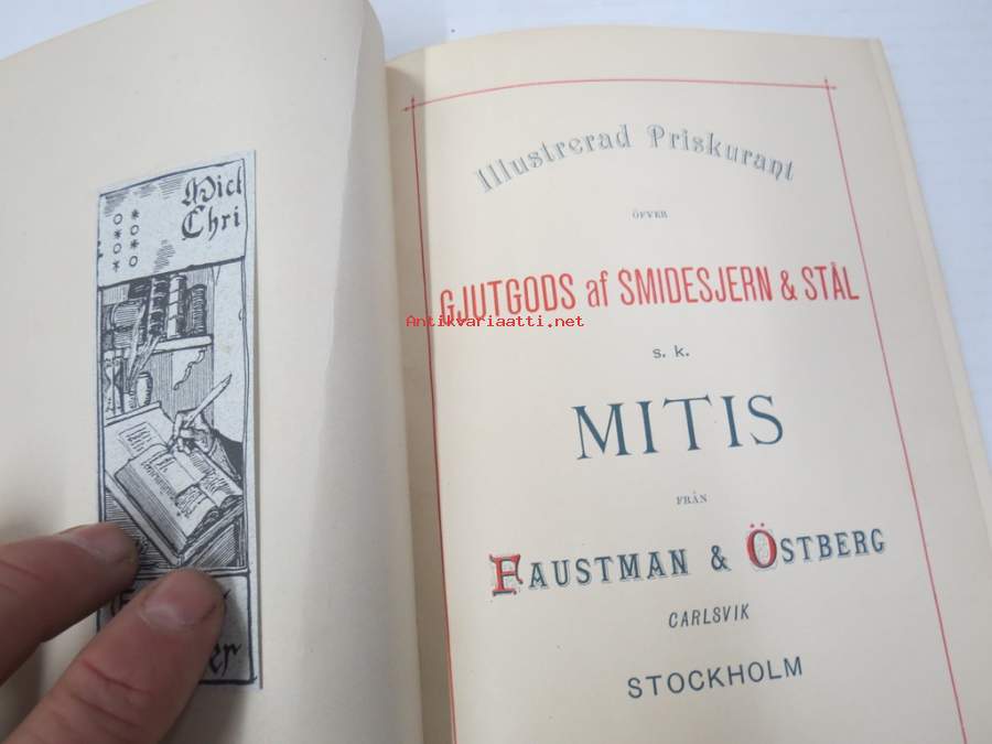 Illustrerad Priskurant öfver Gjutgods af Smidjesjern & Stål s.k. MITIS från Faustman & Östberg (Carlsvik, Stockholm), 1885 -hintaluettelo erilaisille takeille ym.